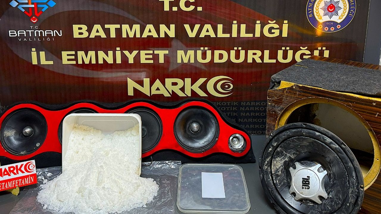 Araçta yapılan aramada, hoparlör içerisine gizlenmiş halde 3 kilo 135 gram metamfetamin maddesi ele geçirildi.
