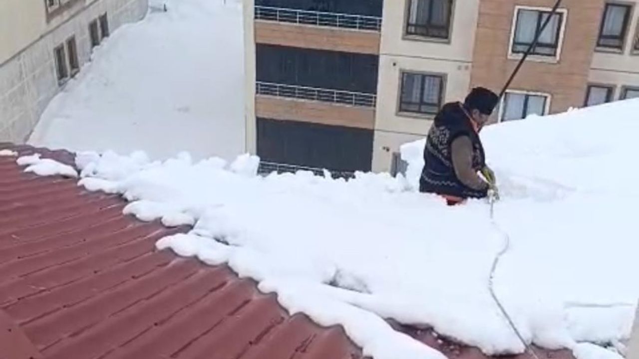 DİYARBAKIR HABER - Hakkari'nin Yüksekova ilçesinde kar kalınlığının 1 metreyi, yüksek kesimlerde ise 3 metreyi bulmasıyla hayat durma noktasına geldi. Binaların çatılarında biriken dev kar kütleleri, vatandaşları temizlik mesaisine yöneltti. Esentepe Mahallesi'ndeki Pizok TOKİ konutlarında kar temizliği yapan Tahir Yıldız, 8 katlı binanın çatısında çalıştığı sırada ikindi ezanı okundu. Vaktin geçmemesi için aşağı inmeyen Yıldız, montunu karın üzerine sererek namazını kıldı. O anlar, çalışma arkadaşı Yılmaz Akdoğan tarafından cep telefonu kamerasıyla kaydedildi.