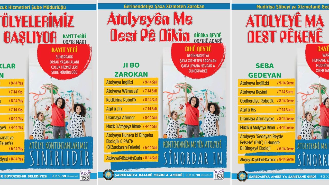 DİYARBAKIR HABER - Diyarbakır Büyükşehir Belediyesi, çocukların sosyal, kültürel ve zihinsel gelişimine katkı sağlamak amacıyla 8 farklı branşta düzenleyeceği atölye çalışmalarının kayıtlarını 9-18 Mart tarihleri arasında alacak.