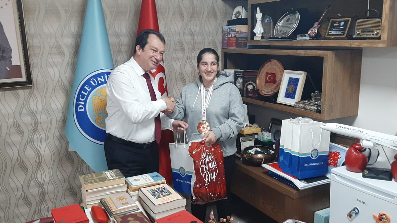 Başarılı sporcular Dicle Üniversitesi Rektörü Prof. Dr. Kamuran Eronat’ı ziyaret ederek madalyalarını takdim etti.
