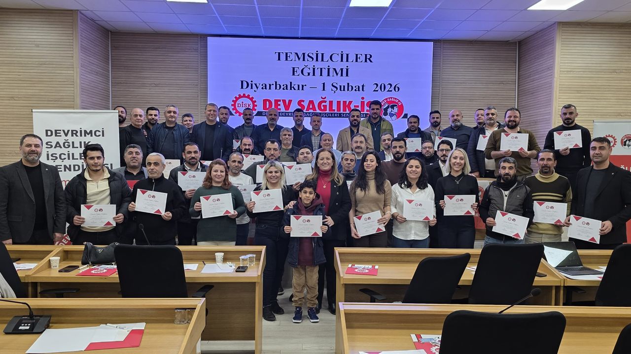 DİYARBAKIR HABER - DİSK/DEV Sağlık-İş Sendikası, Bölge Temsilciler Kurulu Eğitimini 1 Şubat 2026 tarihinde Diyarbakır Ticaret ve Sanayi Odası Eğitim Salonu’nda gerçekleştirdi. Diyarbakır Bölge Şubesi’nin faaliyet alanı içerisinde bulunan illerden yaklaşık 60 işyeri temsilcisinin katıldığı eğitim programı yoğun ilgi gördü.