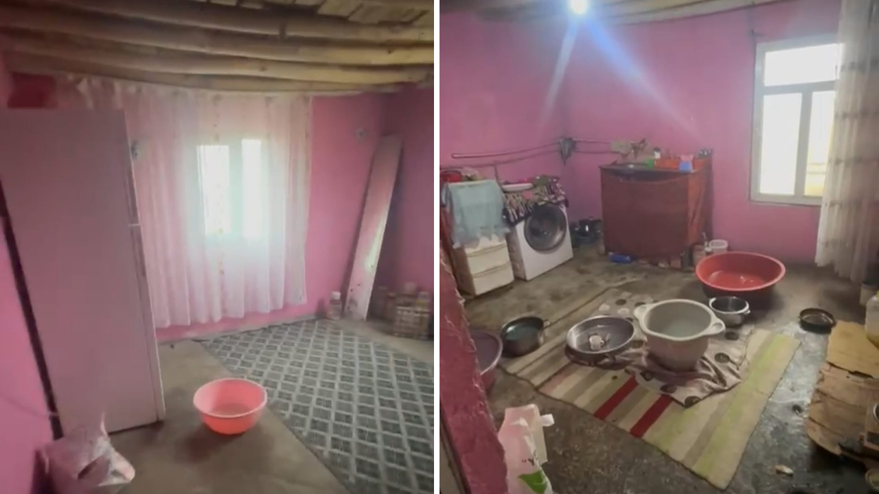 Evin içinde ne mutfak dolapları sağlam ne de kapılar kullanılabilir durumda. Nem yüzünden duvarlar dökülmüş, tavan her yağmurda su sızdırıyor, aile gece uyurken bile tencerelerle kovalarla su toplamaya çalışıyor.