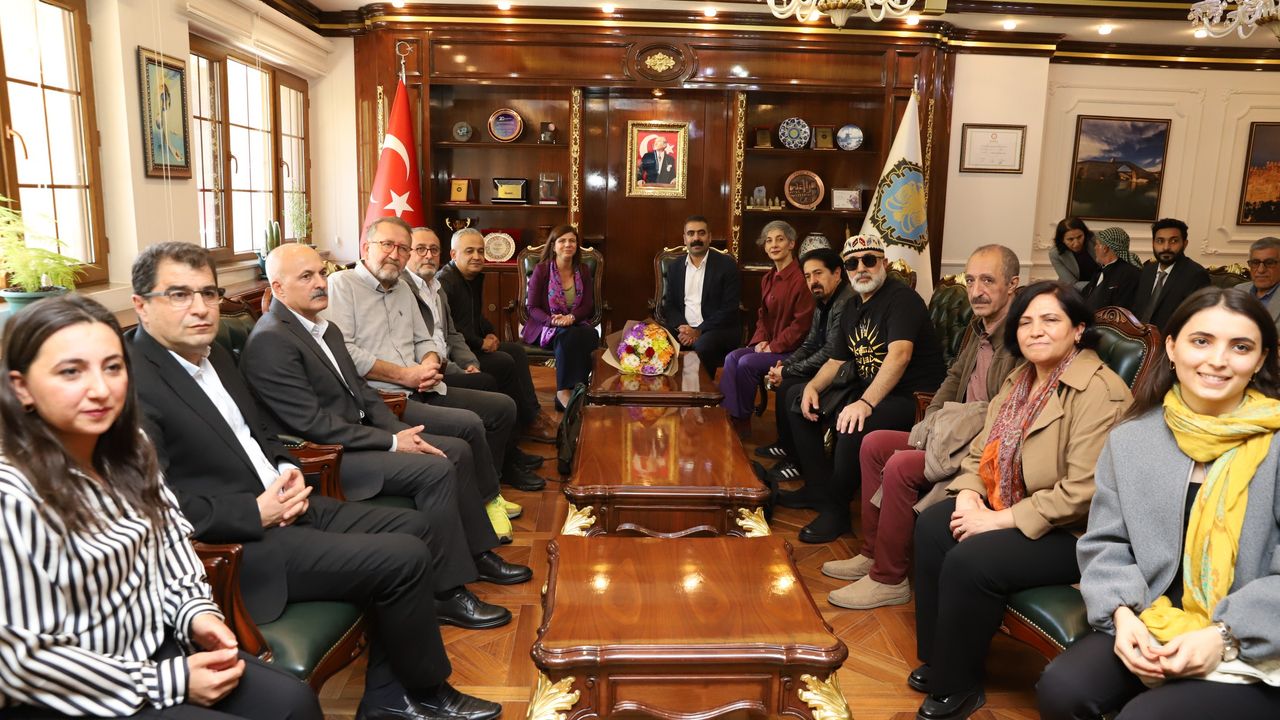DİYARBAKIR HABER - Diyarbakır Büyükşehir Belediyesi ve Kayapınar Belediyesinin ev sahipliğinde, 30 yıl aradan sonra yeniden Diyarbakır’da konser verecek olan Koma Amed grup üyeleri, havaalanındaki karşılamanın ardından Büyükşehir Belediyesine geçti. Koma Amed grup üyeleri, belediye hizmet binasının önünde Büyükşehir Belediyesi Eşbaşkanları Serra Bucak ve Doğan Hatun ile DBB Meclisi üyeleri, Genel Sekreter Emrullah Gördük ve Genel Sekreter Yardımcıları tarafından karşılandı. Duygusal anların yaşandığı karşılamanın ardından grup üyeleri, Eşbaşkanlarla birlikte şarkılar ve zılgıtlar eşliğinde Büyükşehir Belediyesine geçti.