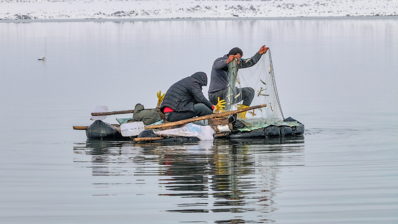 Kelek üzerinde balık tutan balıkçılar, göl kenarında avlanan balıkçıl kuşlar ve kızıl tilkinin beyaz örtü altında tarla faresini yakalama telaşı ise dronla görüntülendi.