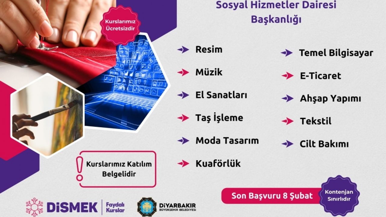 Sosyal Hizmetler Dairesi Başkanlığı koordinesinde yürütülen Diyarbakır Sanat ve Mesleki Eğitim Kursları (DİSMEK) kursları kapsamında bu dönem taş işleme, kuaförlük, cilt bakımı, ahşap yapımı, resim, müzik, el sanatları, tekstil ve moda tasarımı alanlarında eğitimler verilecek. Ayrıca DİSMEK bünyesinde E-Ticaret ve Temel Bilgisayar kursları da bu dönem ilk kez kursiyerlerle buluşturulacak.