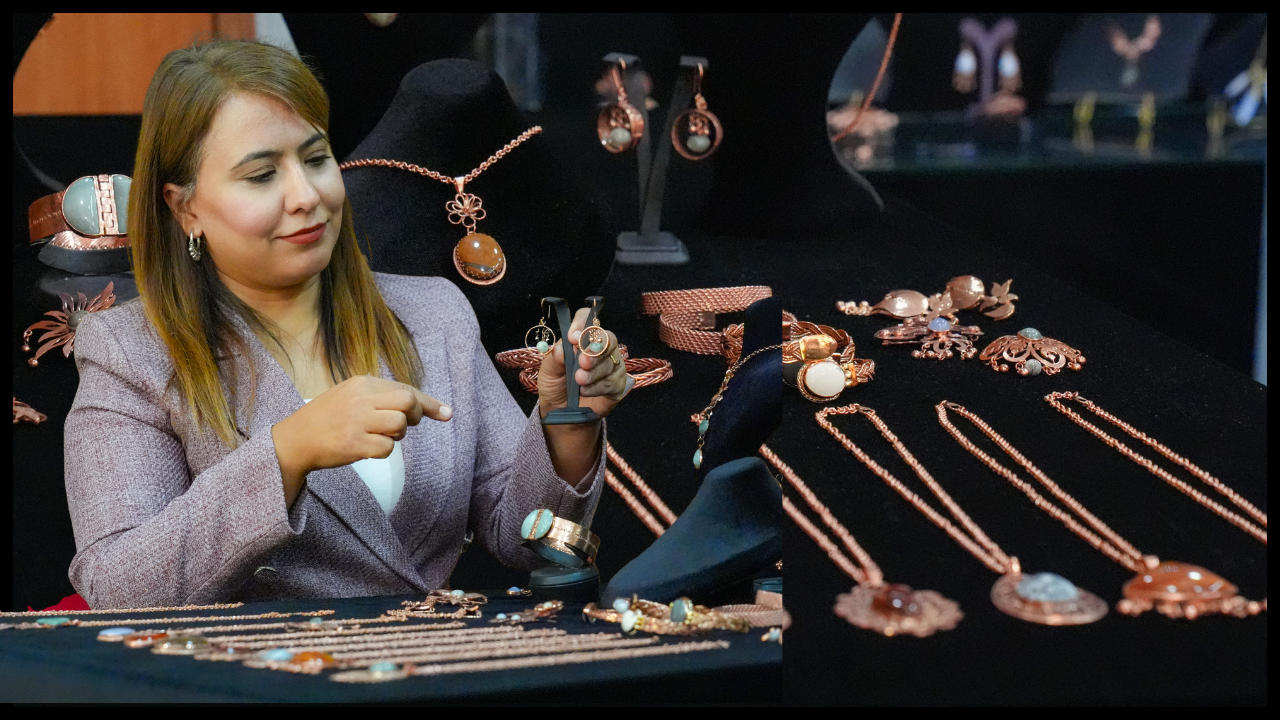 Soyulan, eritilen ve kalıplarda plakalara dönüştürülen bakır, doğadan toplanan ve atölyelerde işlenen yarı değerli taşlarla buluşturularak usta ellerde 40'ı aşkın kolye, küpe, yüzük ve bilezik hazırlandı.