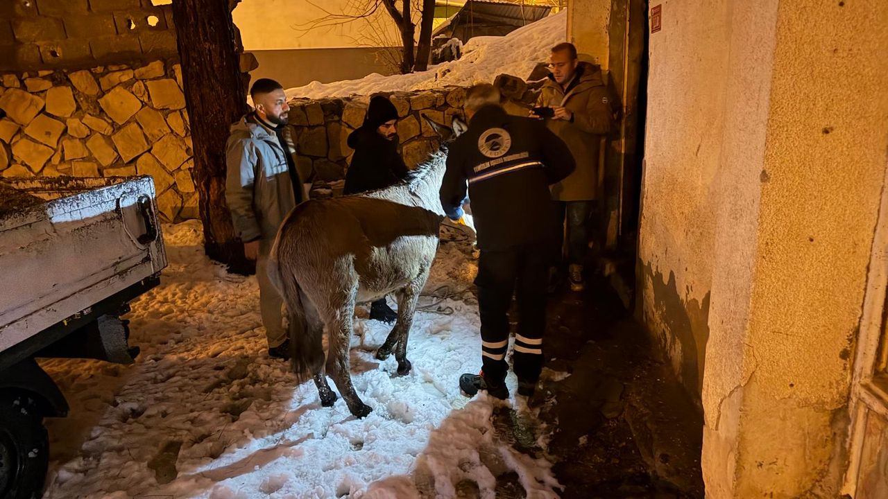 Olay yerine sevk edilen belediye veteriner hekimi ve saha ekipleri, kar nedeniyle bitkin düşen eşeğe ilk müdahaleyi bulunduğu noktada yaptı.