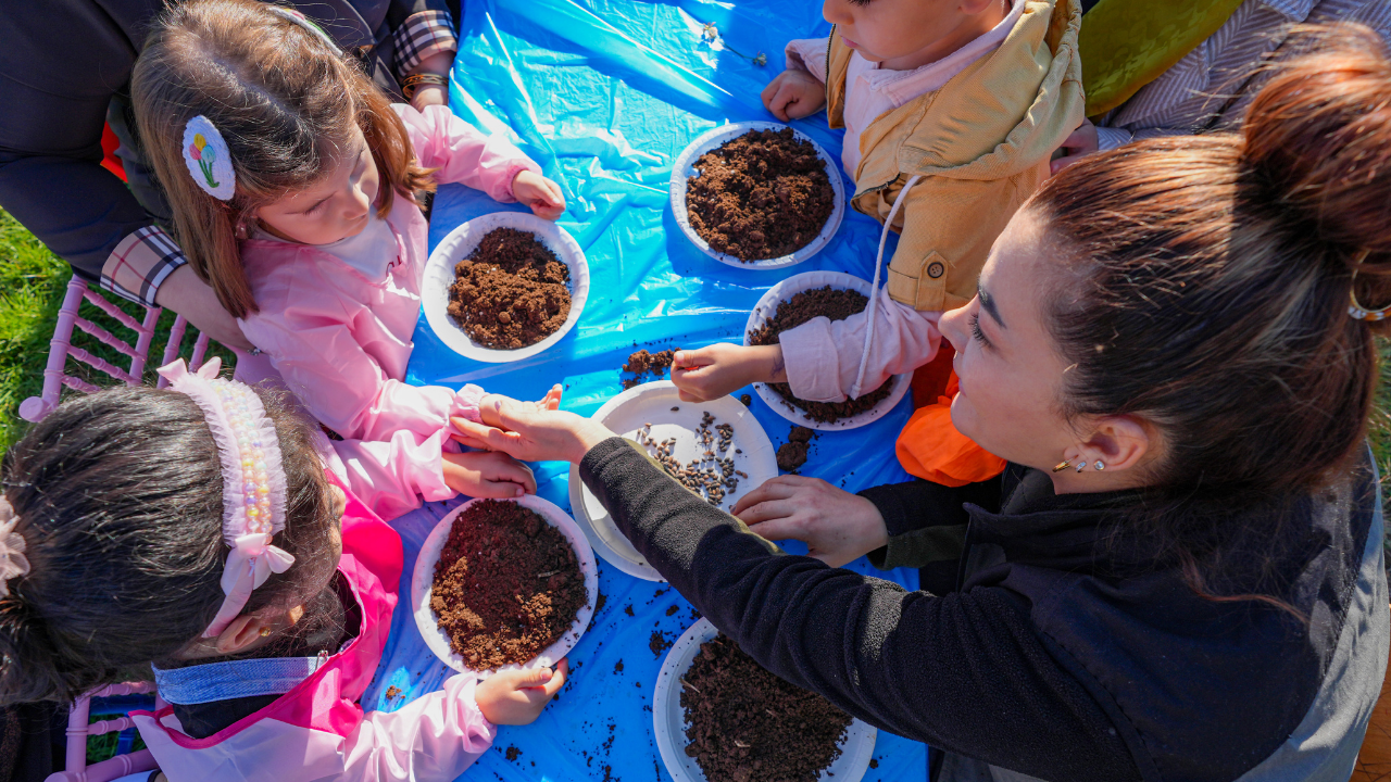 Adalet Anaokulu'nda düzenlenen etkinlikte de öğrenciler ebeveynleri, öğretmenleri ve orman mühendislerinin yardımıyla kazdığı toprağı çamur haline getirip içerisine tohum koydu.