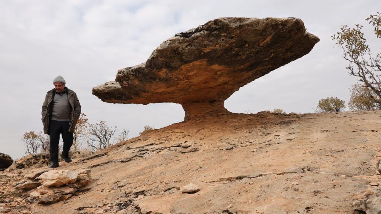 Diyarbakır'ın Kocaköy ilçesine yaklaşık 4 kilometre uzaklıkta olan "mantar kaya" veya diğer adıyla "kalkan kaya", hayrete düşüren yapısıyla dikkat çekiyor. İnce bir sütunla ayakta duran geniş kaya parçası, yıllara meydan okuyor. Antropolog Naci Akdemir, bulunulan yerin sediment tortulu kaya kütlelerinden oluşan bir zemin olduğunu söyledi. Arazinin, Afrika-Arabistan plakasının Avrasya'yı kuzeye doğru itmesiyle oluştuğunu belirten Akdemir, bu arazinin şu anda hem yükseldiğini hem de kuzeye doğru gittiğini ifade etti.