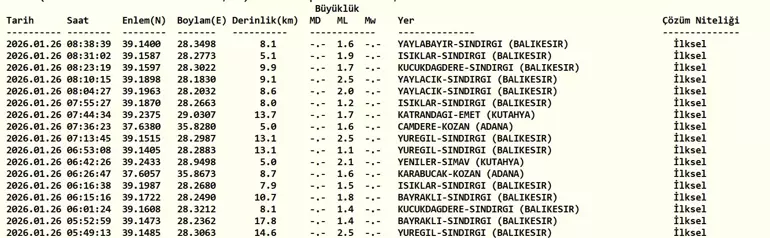 Kütahya'da deprem mi oldu?" sorularına yanıt arıyor. İşte, 26 Ocak Pazartesi günü Kandilli Rasathanesi ve AFAD tarafından yayımlanan son depremler listesi...