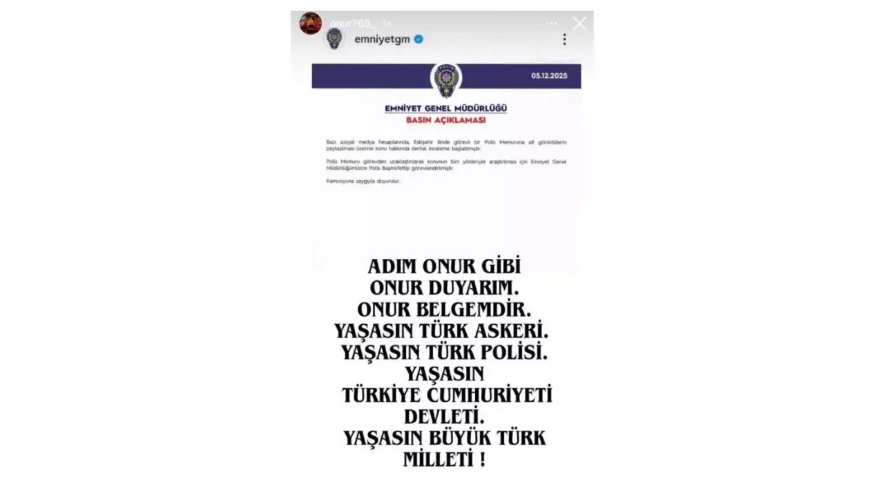Emniyet Genel Müdürlüğü memuru açığa alarak inceleme başlattı. Açığa alınan polis, "Adım Onur gibi onur duyarım" diyerek sosyal medyadan açıklama yaptı.