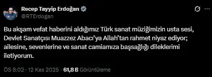 “Bu akşam vefat haberini aldığımız Türk sanat müziğimizin usta sesi, Devlet Sanatçısı Muazzez Abacı’ya Allah’tan rahmet niyaz ediyor, ailesine, sevenlerine ve sanat camiamıza başsağlığı diliyorum.”
