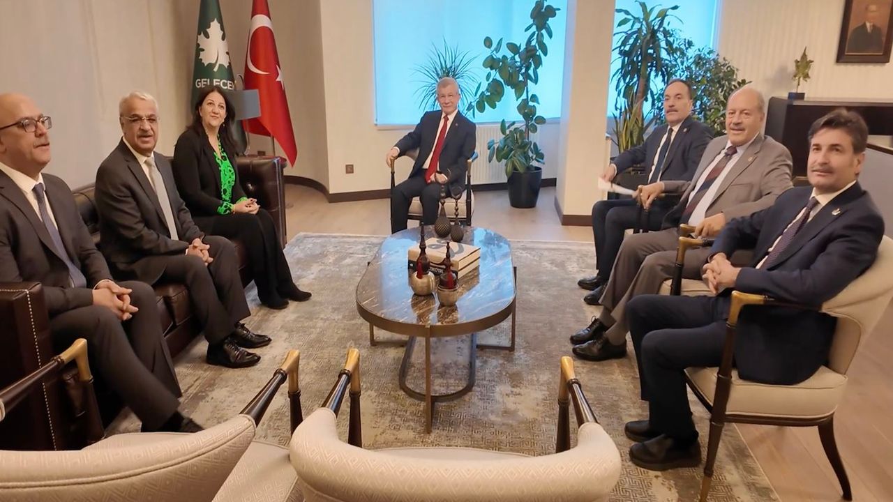 Davutoğlu, Gelecek Partisi Genel Merkezi’ne gelen DEM Parti İmralı Heyeti üyelerini kapıda karşıldı.