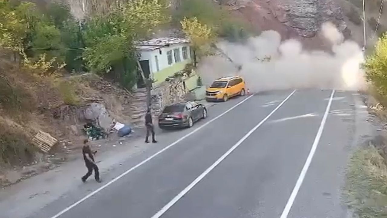 DİYARBAKIR HABER - Tunceli'de, yol kenarında aracının yanında bekleyen taksi şoförü, dağdan kopan kaya parçalarının altında kalmaktan son anda kurtuldu. Bir vatandaşın "Kaç!" diye bağırmasıyla saniyeler içinde bölgeden uzaklaşan şoförün yaşadığı anlar güvenlik kamerasına yansıdı.