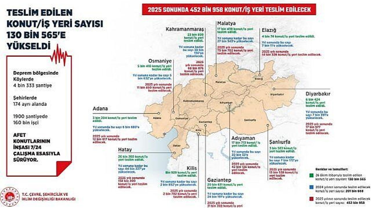Bugüne kadar Adana"da 3 bin 204 konut/iş yeri teslim edildi. Yıl sonunda bu sayı 6 bin 680"e yükselecek. Adıyaman"da 17 bin 713 konut/iş yeri teslim edildi. Yıl sonunda bu sayı 30 bin 33"e yükselecek. Diyarbakır"da 6 bin 424 konut/iş yeri teslim edildi. Yıl sonunda bu sayı 7 bin 391"e yükselecek. Elazığ"da 4 bin 74 konut/ iş yeri teslim edildi. Yıl sonunda bu sayı 7 bin 11"e yükselecek. Gaziantep"te 20 bin 631 konut/iş yeri teslim edildi. Yıl sonuna kadar bu sayı 24 bin 191"e yükselecek. Hatay"da 26 bin 260 konut/iş yeri teslim edildi. Yıl sonuna kadar bu sayı 44 bin 227"ye yükselecek. Kahramanmaraş"ta 23 bin 899 konut/iş yeri teslim edildi. Yıl sonuna kadar bu sayı 39 bin 136"ya yükselecek. Kilis"te bin 929 konut/iş yeri teslim edildi. Yıl sonuna kadar bu sayı 2 bin 852"ye yükselecek. Malatya"da 17 bin 438 konut/iş yeri teslim edildi. Yıl sonuna kadar bu sayı 27 bin 343"e yükselecek. Osmaniye"de 5 bin 410 konut/iş yeri teslim edildi. Yıl sonuna kadar bu sayı 5 bin 632"ye yükselecek. Şanlıurfa"da 3 bin 583 konut/iş yeri teslim edildi. Yıl sonuna kadar bu sayı 7 bin 172"ye yükselecek.