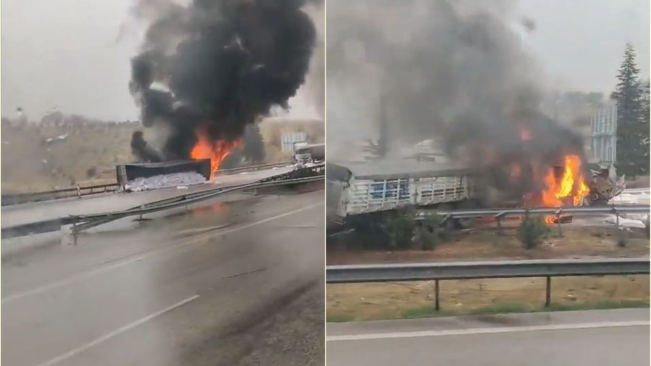 Çarpışmanın ardından araçlarda yangın çıktı ve kısa sürede büyüyen alevler tırları sardı.